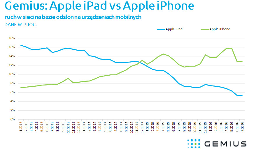 Gemius przeanalizował odsetek odsłon wykonywanych przez polskich internautów na urządzeniach mobilnych Apple iPhone i iPad. W analizie uwzględniono okres od stycznia 2013 roku do lipca 2016 roku.