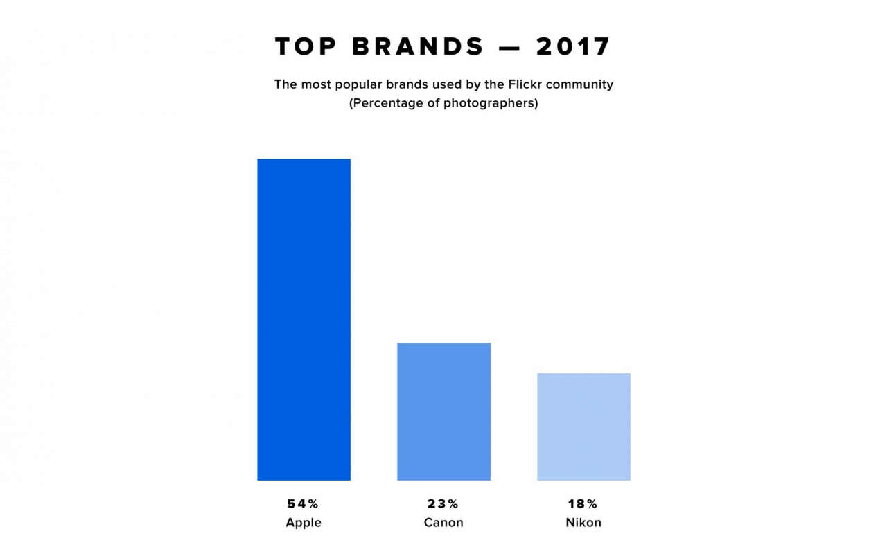W ciągu ostatnich kilku lat iPhone z roku na rok zwiększał udział w rocznych rankingach Flickr. W 2015 roku iPhone był używany do 42 procent zdjęć udostępnionych Flickr, a w 2016 smartfony Apple znów znalazły się na pierwszym miejscu już z 47 procentami. Firma Apple po raz pierwszy wyprzedziła firmę Nikon, stającą się drugą najpopularniejszą marką aparatów w rankingu Flickr w 2014 roku.