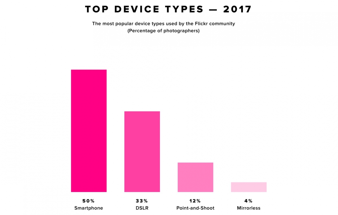 Lista czołowych typów urządzeń pozostaje niezmieniona od lat, ale w 2017 roku wzrósł udział smartfonów odpowiadających za 50 procent zdjęć przesłanych do serwisu Flickr, co stanowi wzrost z 48 procent w zeszłym roku. DSLR czyli cyfrowe lustrzanki zajęły drugie miejsce z 33 procentami (wzrost z 25 procent w zeszłym roku). Na trzeciem miejscu znalazły się proste aparaty kompaktowe z 12 procentami (z 21 procent), a na czwartym aparaty bezlusterkowe z wynikiem 4 procent (wzrost z trzech procent).