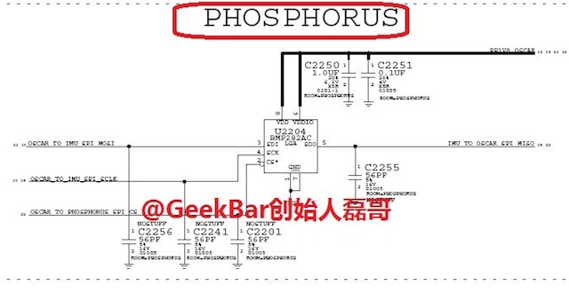 Dziś z rana, aktywny od kilku dni GeekBar opublikował w serwisie Weibo kolejny schemat elektroniczny interpretując go jako nowej generacji ko-procesor M7 dla iPhone’a 6 o nazwie „Phosphorus.” Obecny ko-procesor M7 gromadzi i śledzi dane z różnych czujników ruchu w iPhone’ie 5S, iPadzie Air i iPadzie mini Retina. W związku z tym, że iPhone 6 ma posiadać szereg nowych czujników związanych ze zdrowiem i fitnessem przypuszczano, że to mocniejsza wersja M7 przeznaczona do nowego urządzenia.