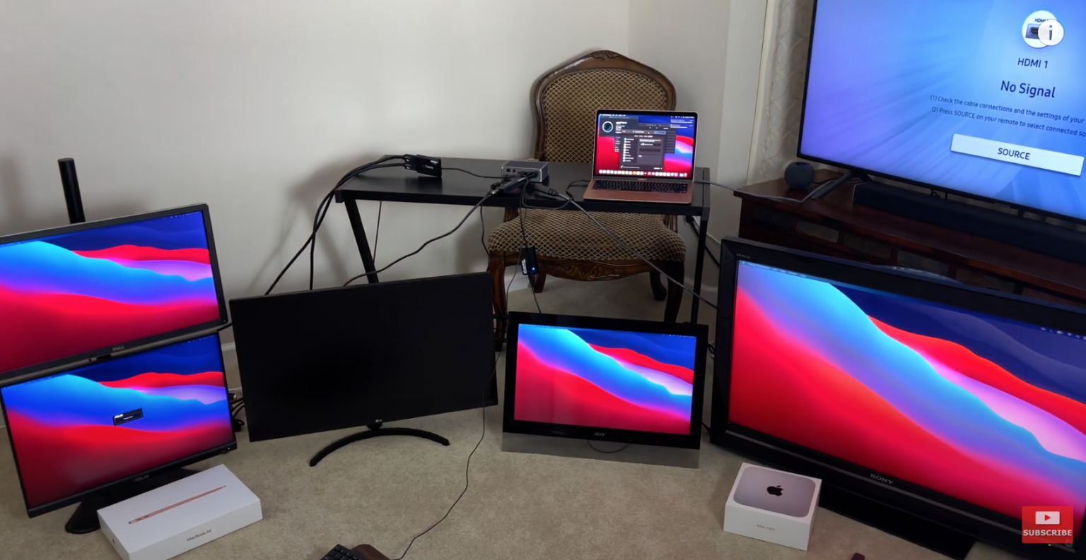 Według YouTubera Ruslana Tulupova nowy Mac mini z procesorem M1 daje możliwość uruchomienia do sześciu zewnętrznych wyświetlaczy, a MacBook Air i MacBook Pro z procesorem M1 pięciu zewnętrznych wyświetlaczy. Można to zrobić za pomocą adapterów DisplayPort. Co ważne, to znacznie przekracza ograniczenia określone przez Apple dotyczące zewnętrznych wyświetlaczy z komputerami Mac M1.