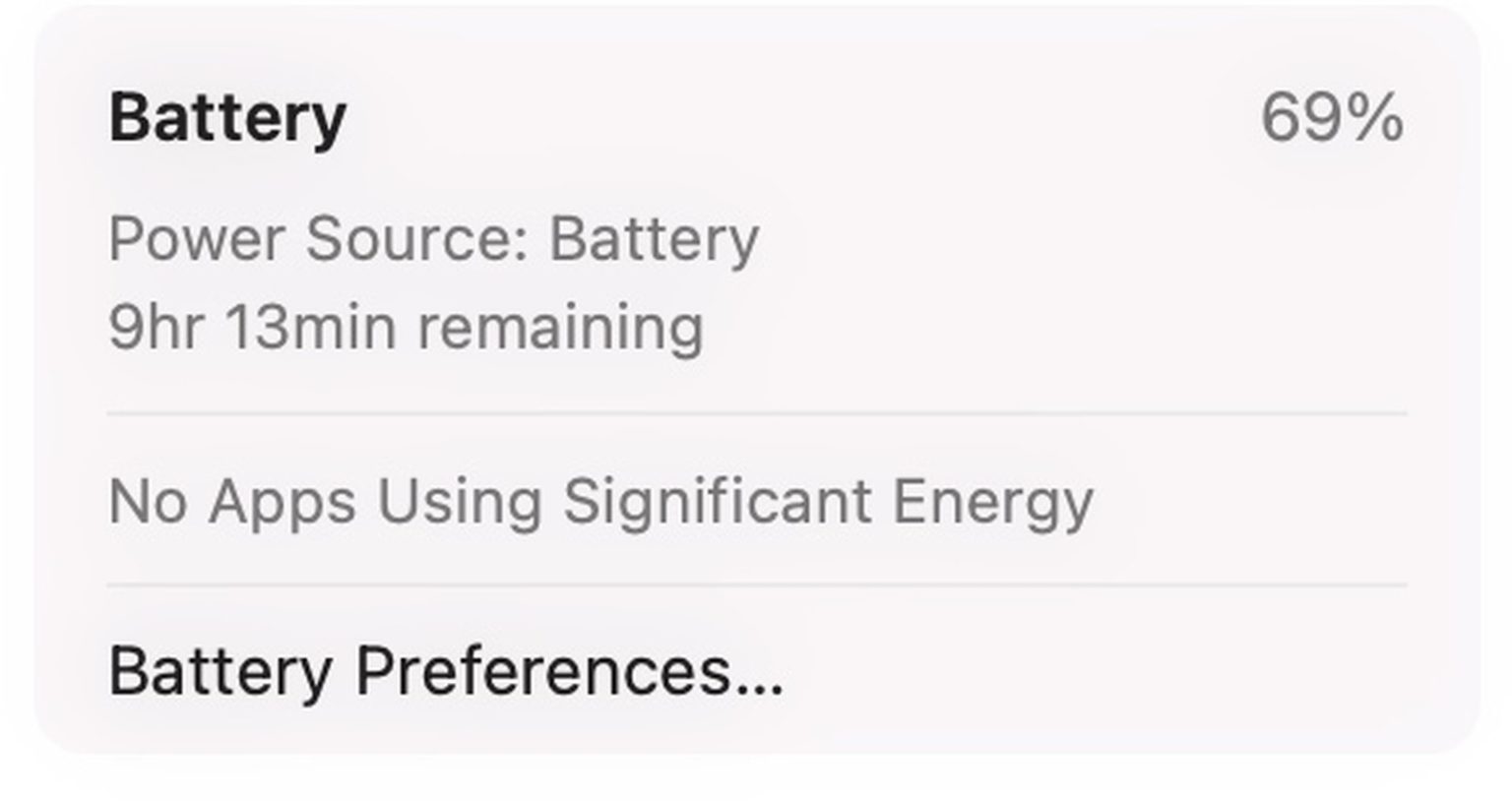 Ikona baterii na pasku menu wyświetla również aplikacje, które zużywają znaczną ilość energii, tak jak w macOS Catalina, i zapewnia opcję otwarcia Preferencji baterii. Jednak wydaje się, że nie ma opcji wyświetlania bieżącego procentu żywotności baterii bezpośrednio na pasku menu.