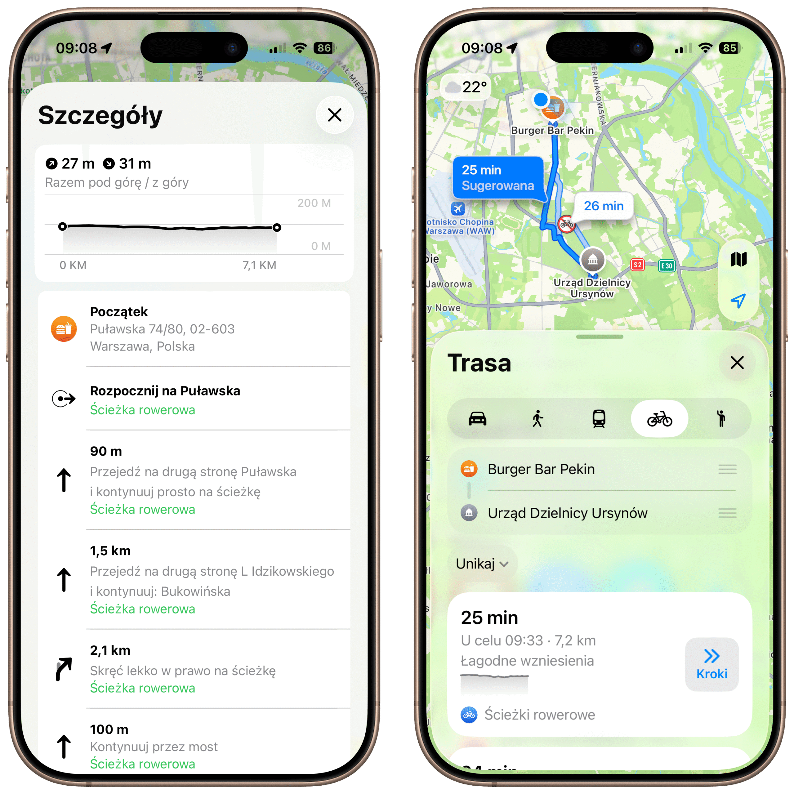 Całkowicie bez rozgłosu Apple umożliwił polskim użytkownikom aplikacji Apple Mapy w całej Polsce opcję rozbudowanej nawigacji rowerowej. Nowa funkcja oferuje szczegółowe wskazówki „zakręt po zakręcie” dla tras rowerowych, prowadzących zarówno wyznaczonymi ścieżkami, jak i pasami rowerowymi czy drogami przyjaznymi dla jednośladów.