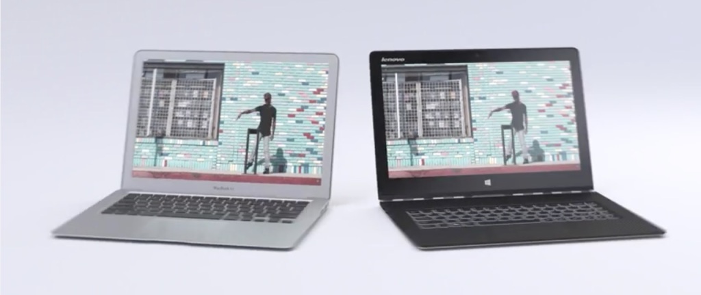 Microsoft na początku zwraca uwagę na grubość obu urządzeń, pokazując, że MacBook Air ma 17mm grubości natomiast Yoga 3 Pro ma 13mm grubości. Następnie oba laptopy są przedstawione z pozycji „tablet” i „namiot”, prezentując zdolność Yoga 3 Pro do odwracania wyświetlacza wokół własnej osi, podczas gdy MacBook Air nie jest w stanie tego zrobić. Microsoft w końcu podkreśla dotykowy wyświetlacz Yogi 3 Pro, gdzie MacBooku Air oczywiście tej zdolności nie posiada.