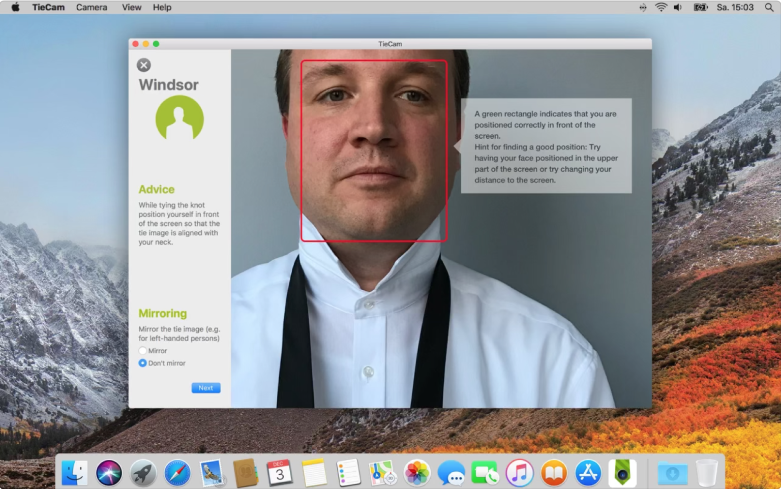 TieCam korzysta z kamery wbudowanej w komputer aby krok po kroku przeprowadzić Cię przez kolejne etapy wiązania krawata. Z programem zobaczysz bezpośrednio na ekranie swoje odbicie, i podpowiedzi jak zawiązać idealny węzeł krawata. Wszystko co musisz zrobić, to usiąść sobie w odpowiedniej pozycji i postępować zgodnie z instrukcją, którą da Ci TieCam.