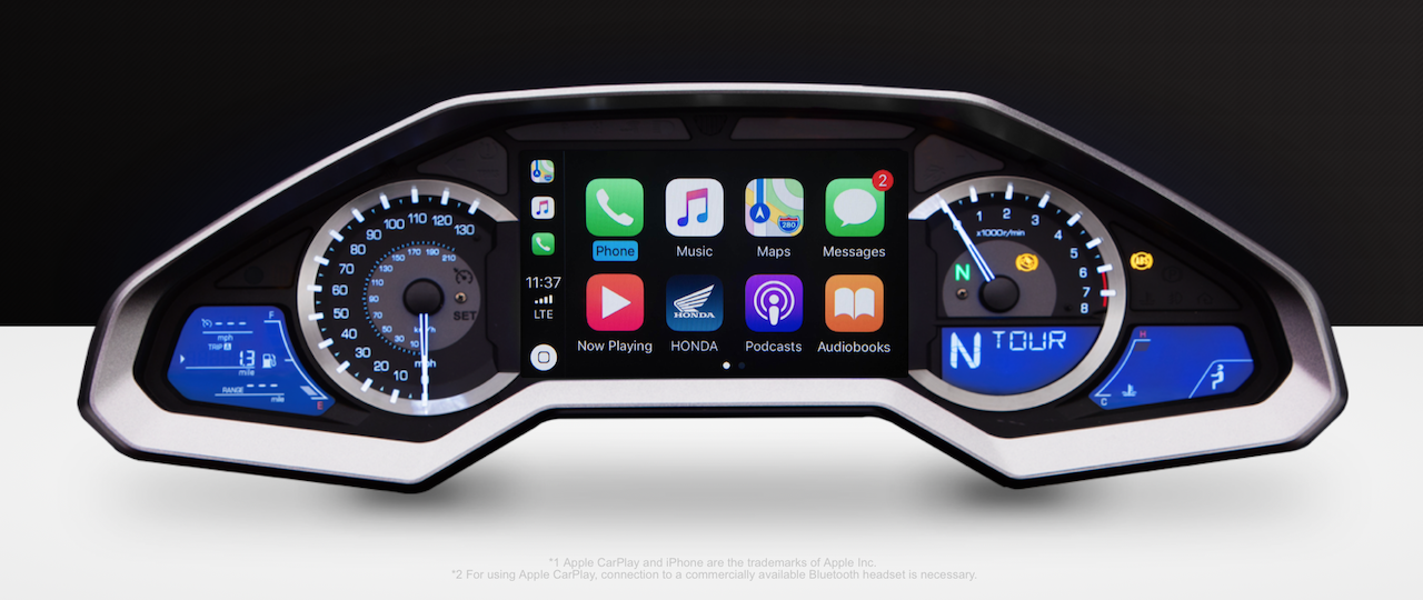 IPhone można podłączyć do motocykla przez USB w bagażniku lub w schowku przy zbiorniku, a następnie uzyskać do niego dostęp za pośrednictwem panelu dotykowego. Aby używać CarPlay w Gold Wing, wymagany jest zestaw słuchawkowy Bluetooth.