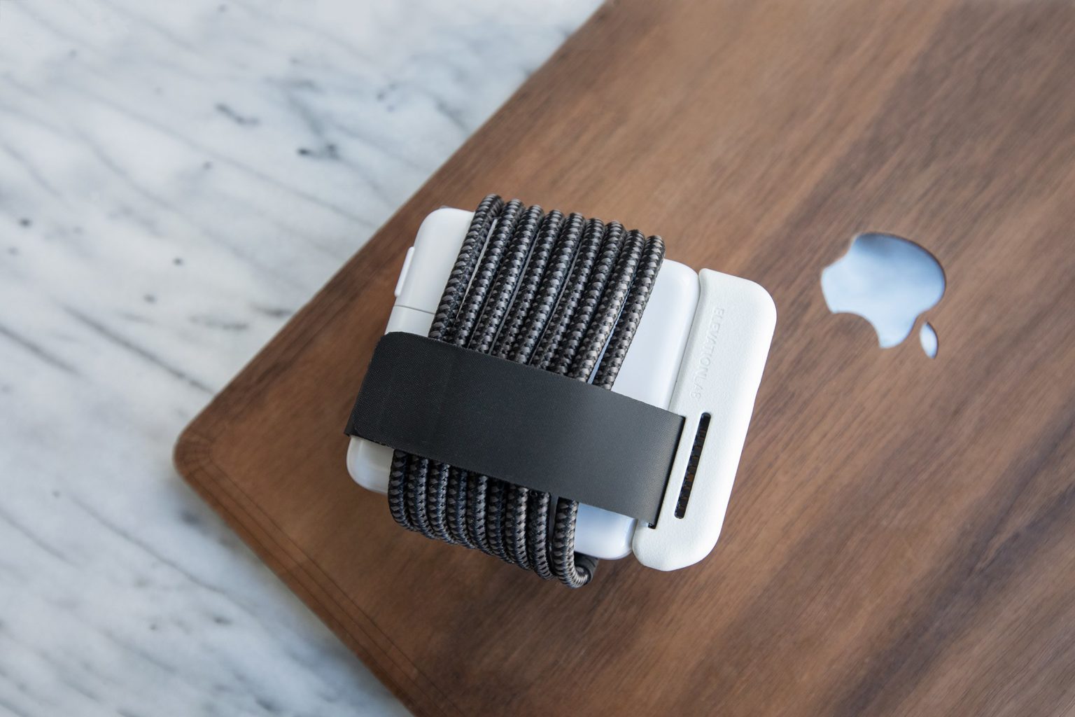 ElevationHub mocuje się do zasilacza MacBooka Pro lub MacBooka Air za pomocą dodanego, gumowego paska na rzep, który utrzymuje zwinięty przewód USB-C, a także zapewnia dodatkowe porty, których nie mają już modele MacBooka.