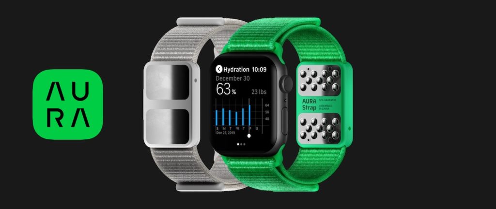 Pasek mocowany do zegarka Apple Watch ma czujniki, które opierają się o nadgarstek, aby wykonywać regularne pomiary. AURA twierdzi, że jest w stanie mierzyć zmiany ciała w wyniku ćwiczeń, oferując pomiary bilansu tłuszczu, mięśni i wody na Apple Watch.