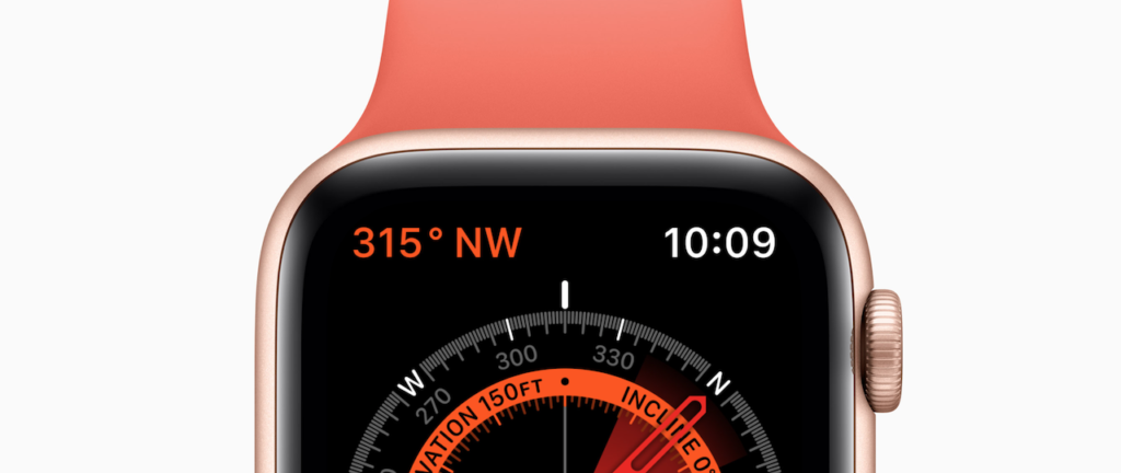 Nowością w modelach Apple Watch Series 5 jest wbudowany kompas, który pozwala użytkownikom zobaczyć, w którą stronę patrzysz, wraz z nową aplikacją Kompas, która wyświetla kierunek, nachylenie, szerokość, długość i aktualną wysokość.