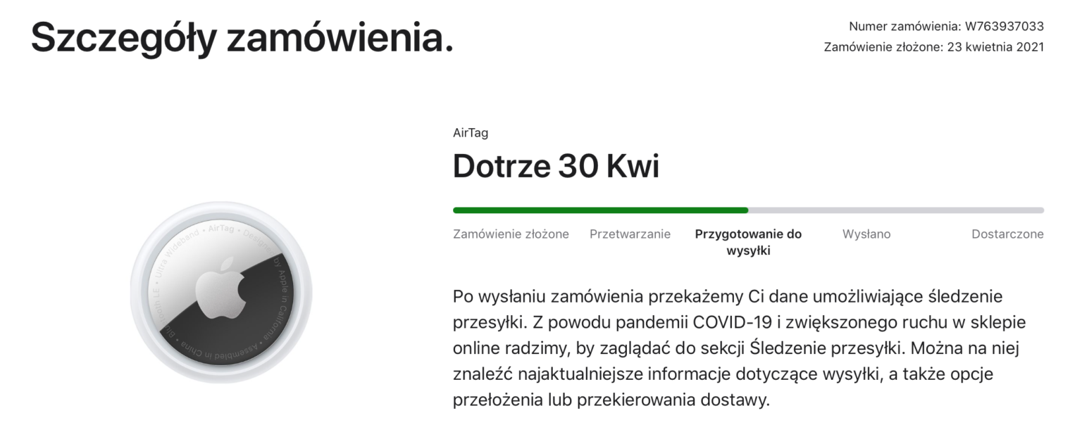Choć zamówienia przedsprzedażowe na AirTag wystartowały dopiero w piątek, to niektórzy klienci, którzy dokonali piątkowego zamówienia, już w ciągu weekendu zobaczyli status na „przygotowanie do wysyłki”. Sam zresztą zauważyłem taki status u siebie.