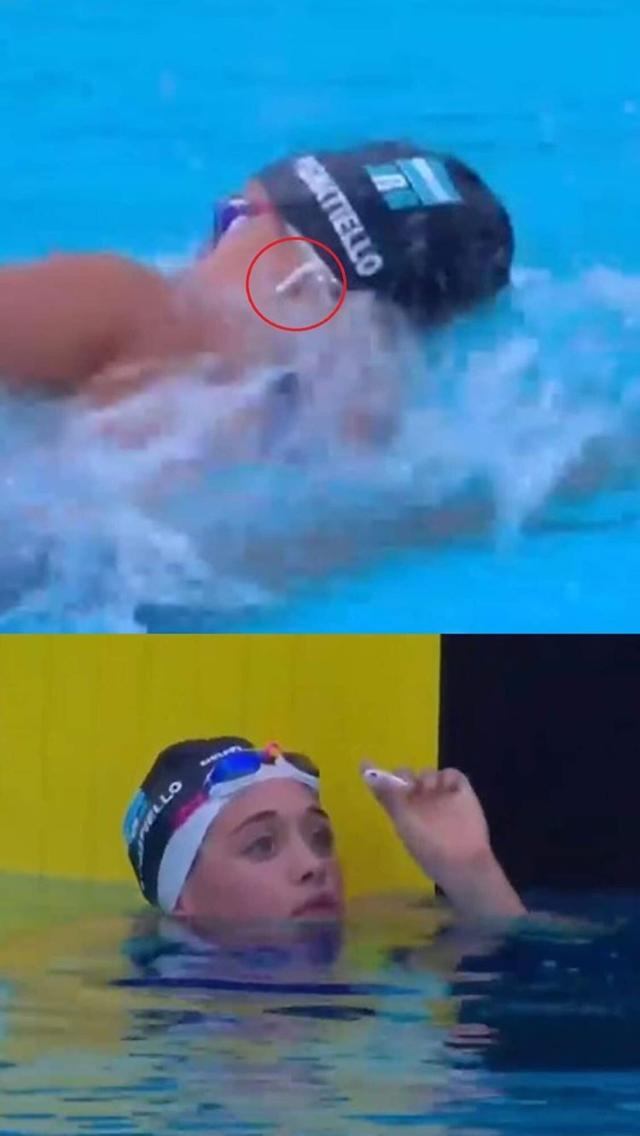 Mimo że zajęła drugie miejsce na 800-metrów w stylu dowolnym, Delfina Pignatiello pobiła rekord kraju z czasem 8:24,33. Jej AirPods były w uszach przez cały dystans schowane pod czepkiem.