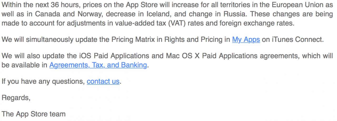 Apple poinformował oficjalnie deweloperów, że w ciągu najbliższych 36 godzin wszystkie ceny w App Store wzrosną we wszystkich niemal krajach Unii Europejskiej, a także w Kanadzie i Norwegii. Ceny na niższe zmienią się jedynie w Islandii.