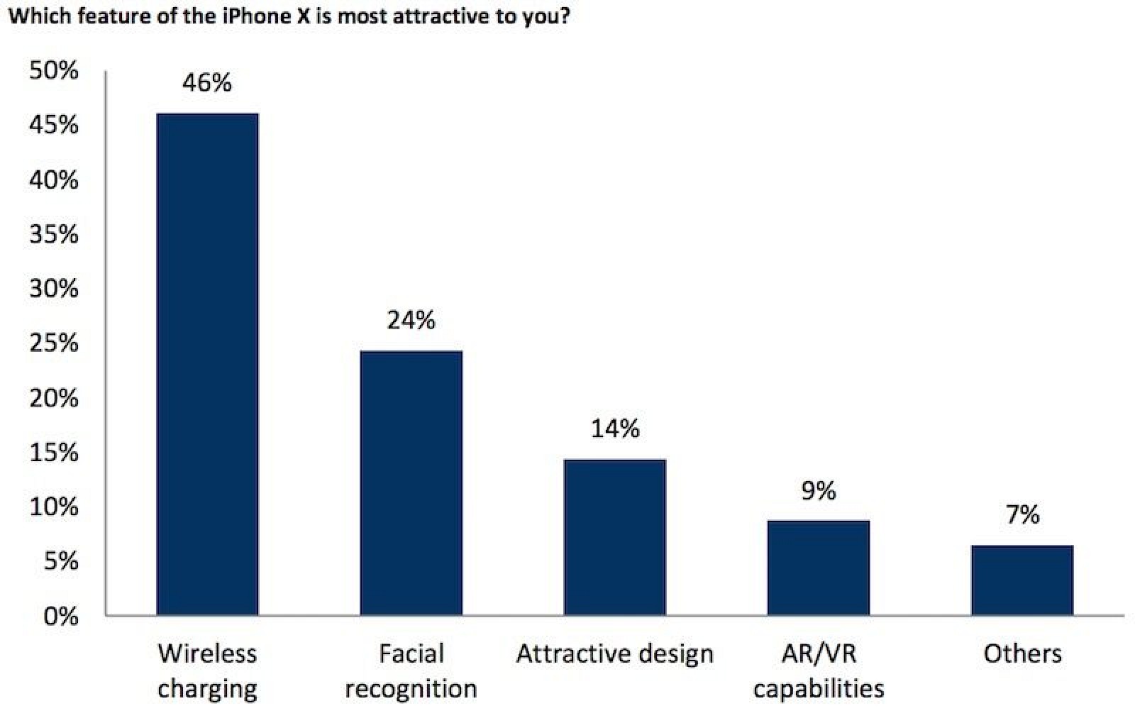 A jaka funkcja nowego iPhone’a X jest najbardziej wyczekiwana przez jego przyszłych nabywców? 46 procent z liczniejszej grupy 4 196 respondentów twierdzi, że ładowanie bezprzewodowe jest najatrakcyjniejszą cechą telefonu iPhone X. To bardzo ciekawe, bo przecież ta możliwość została dodana również do iPhone’a 8.