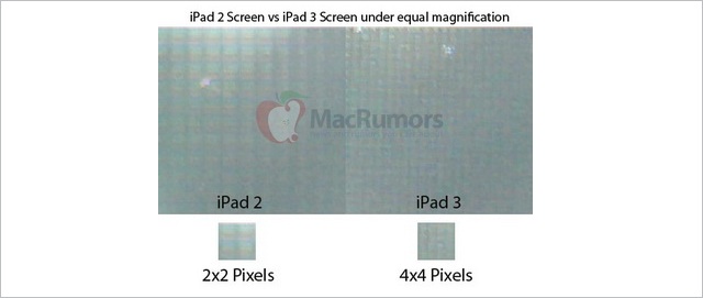Serwisowi MacRumors, udało się uzyskać jeden z wyświetlaczy przyszłego iPada 3 i zbadać go pod mikroskopem w celu ustalenia, czy rzeczywiście jest to ultra-wysokiej rozdzielczości wyświetlacz Retina. Fizyczny rozmiar wyświetlacza iPada 3 jest taki sam jak obecnego iPada 1 i iPada 2 i wynosi 9,7 cala i wygląda dość podobnie do poprzedników gołym okiem.
