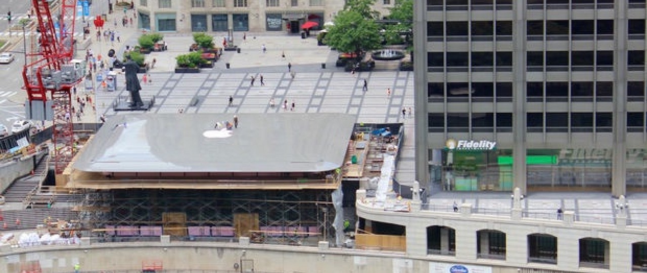 Apple buduje nowy, flagowy salon sprzedaży w Chicago, który ma szklane ściany i cienki dach z włókna węglowego. Wczoraj witryna informacyjna DNAinfo udostępniła zdjęcia dachu sklepu na którym jak się okazuje, Apple dodał swoje białe logo, którego nie było w pierwotnych planach, które sprawia, że szczyt konstrukcji wygląda jak notebook firmy Apple.