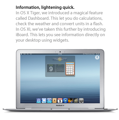 W trakcie oczekiwania na premierę nowego systemu jeden z czytelników Cult of Mac, Cameron Leask zaprezentował swoją wizję tego, jak mógłby wyglądać może nie ten najbliższy, ale kolejny system wypuszczony przez firmę Apple. Połączył on funkcjonalność i wygląd OS X oraz iOS tworząc całkowicie zunifikowany system. Wynik: OS XI, system operacyjny, który łączy najlepsze cechy OS X i iOS oferując Mac’owy dostęp do plików, oraz iOS-owe podejście do danych i aplikacji.