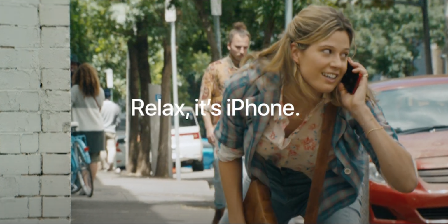 W reklamie, iPhone 12 wyślizguje się kobiecie z ręki i po kilkusekundowej walce aby go złapać wylatuje jej całkowicie i ląduje na ziemi nie odnosząc żadnego uszkodzenia.