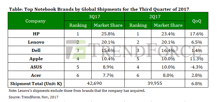 W trzecim kwartale 2017 roku Apple odnotował wysoką sprzedaż w segmencie komputerów MacBook na całym świecie, wynika z nowych badań rynkowych przeprowadzonych przez TrendForce. Sprzedaż laptopów Apple po raz kolejny przewyższyła sprzedaż firmy ASUS, by zająć czwarte miejsce w globalnych dostawach notebooków, co ogólnie oznacza „niezwykły” kwartalny wzrost o 6,8 procent i wzrost rok do roku o 0,9 procenta.