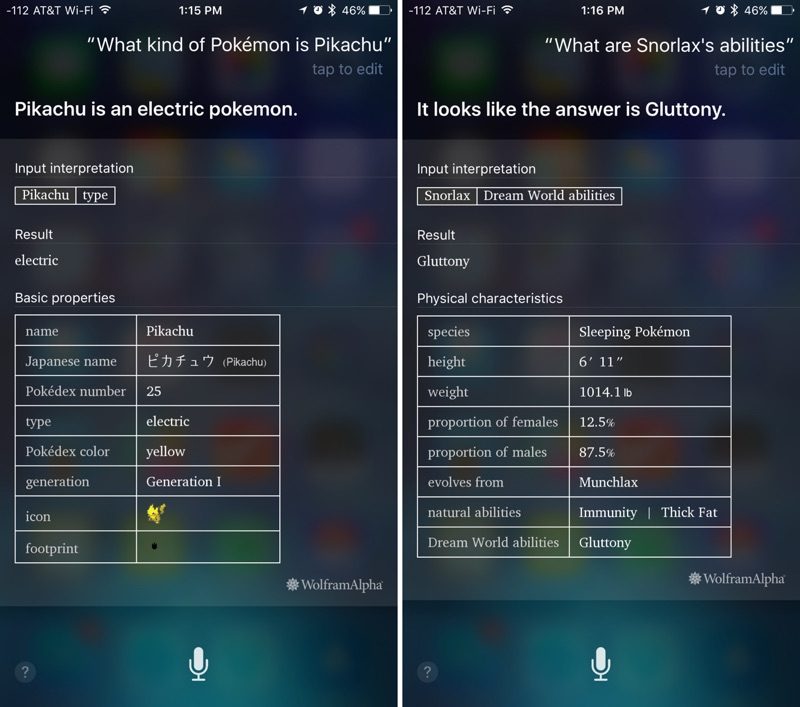 Ponieważ Siri zasysa informacje ze źródeł takich jak Wolfram Alpha, który oferował informacje na temat Pokemonów od 2013 roku, osobisty asystent może również odpowiedzieć na konkretne pytania o Pokemony. Zawarte dane mogą powiedzieć o typie Pokemona, jego zdolnościach, statystykach, ewolucjach jak i bardziej konkretne pytania porównawcze typu, który Pokemon ma najlepszy atak, największą szybkość i więcej.