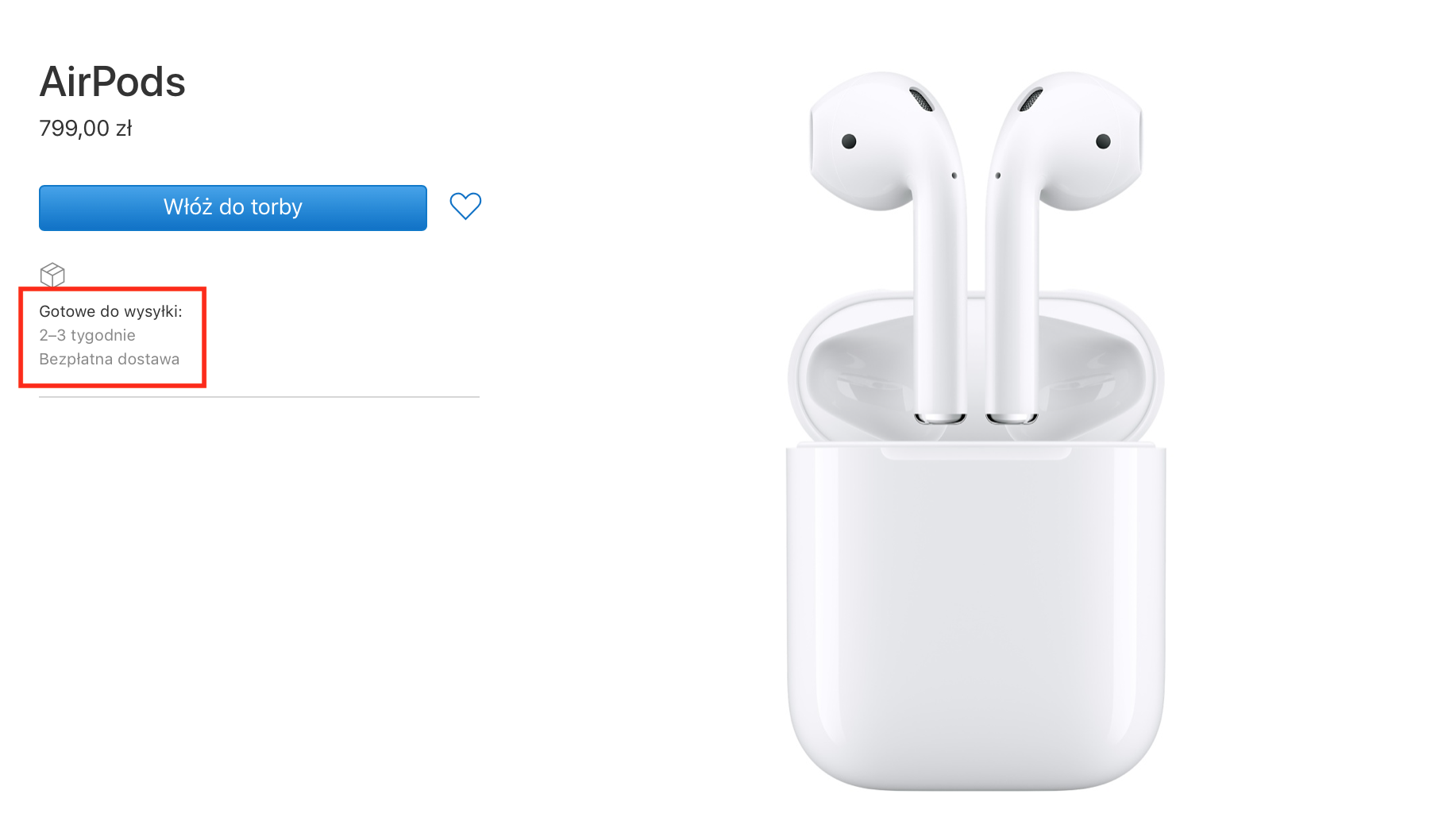 W obecnej prognozie na 2 do 3 tygodni klienci mogą spodziewać się otrzymania zamówionych w sklepie internetowym AirPod na początku września.
