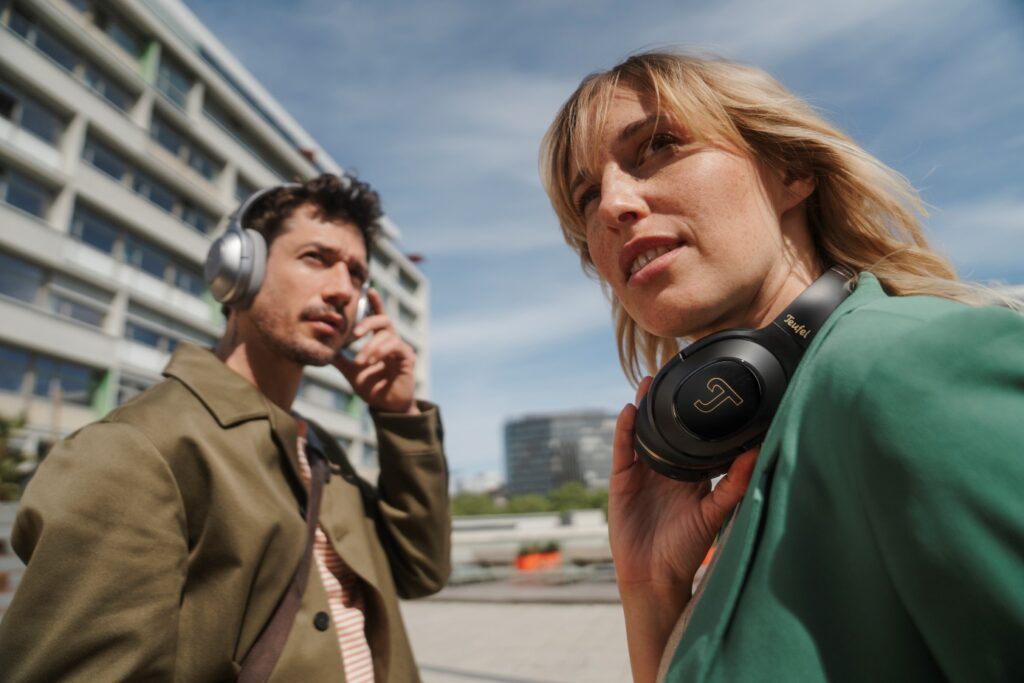 Zamknięta konstrukcja słuchawek odpowiada za pasywne wytłumienie dźwięków zewnętrznych. Natomiast trzy poziomy regulacji aktywnej redukcji szumów (ANC) zapewniają idealne wyciszenie. Przy wybraniu najwyższego poziomu regulacji, technologia ANC niemal całkowicie redukuje hałasy otoczenia, takie jak irytujące stukanie klawiatury i hałasy w biurze, a także szum turbin w samolocie. Jeśli użytkownik chciałby usłyszeć dźwięki zewnętrzne, może włączyć tryb transparentny. Zamiast tłumić hałasy zewnętrzne za pomocą fali dźwiękowej o przeciwnej fazie, tryb transparentny wzmacnia dźwięki z otoczenia. W ten sposób użytkownik nie przegapi już żadnej rozmowy w poczekalni lub komunikatu na dworcu kolejowym. Mikrofony o wysokiej jakości ponadto redukują szum wiatru i hałasy oraz wzmacniają głos podczas rozmów telefonicznych i wideokonferencji.