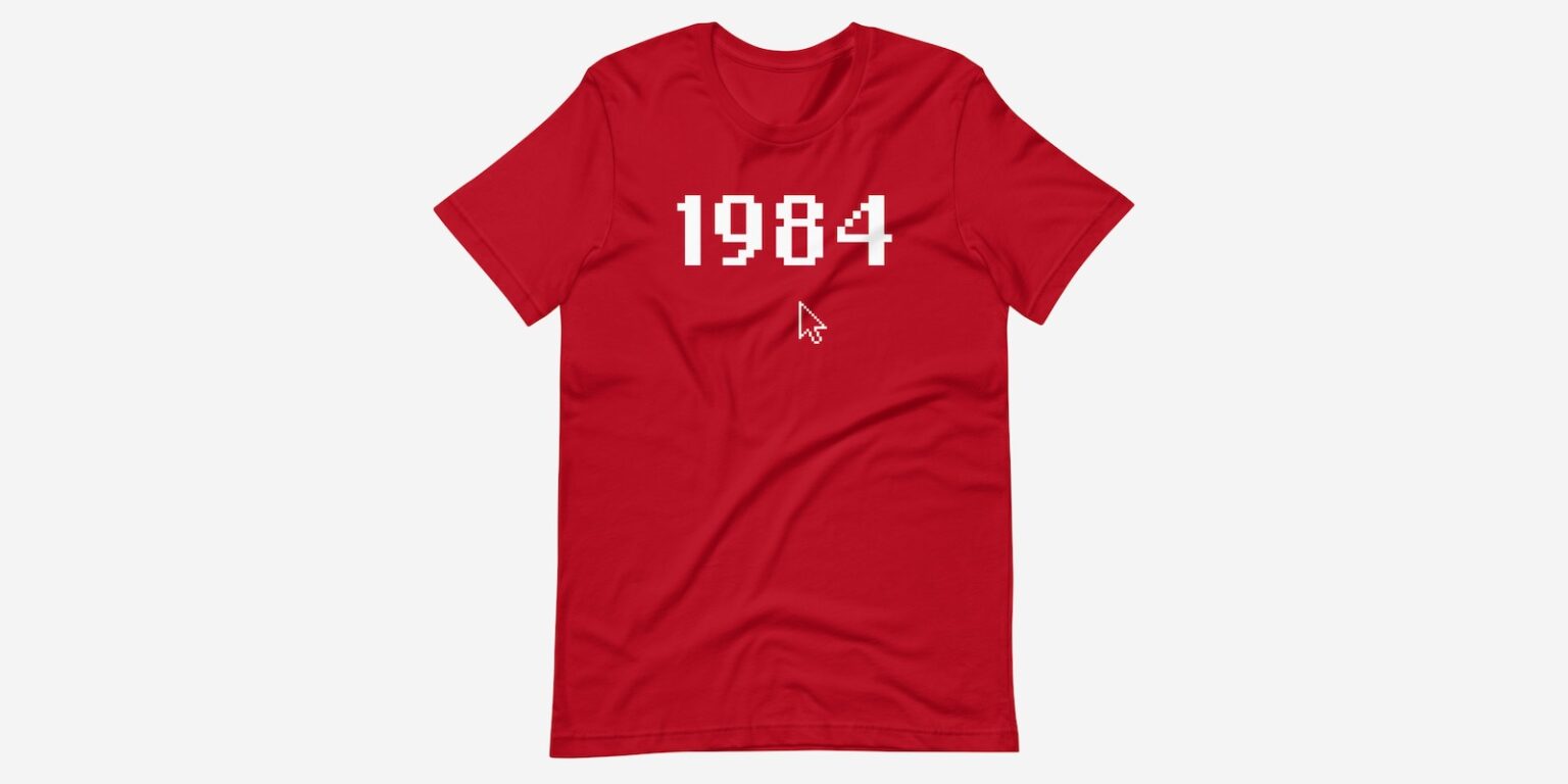 Wśród grafik znajdziemy również tęczowe kolory z listą najważniejszych produktów Apple, takich jak Macintosh, iMac, iPod i iPhone, a także projekt 1984, który nawiązuje do klasycznej reklamy Apple, oraz t-shirt „Think Different (Again)”.