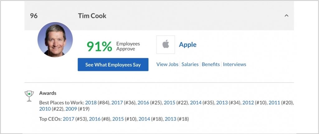 Pomimo tego, że Tim Cook jest na 96 miejscu, to zyskał on pozytywną ocenę od 91 procent pracowników. Apple ma łącznie 12 056 opinii pracowników na Glassdoor.