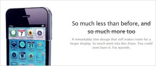iFaux jest małym dodatkiem w stylu „zrób to sam”, który możemy zgrabnie zamontować na górze iPhone’a 4 lub 4S, dodając mu kilka  dodatkowych milimetrów w wysokość potrzebnych, aby sprostać dzisiejszym „wyższym standardom”.