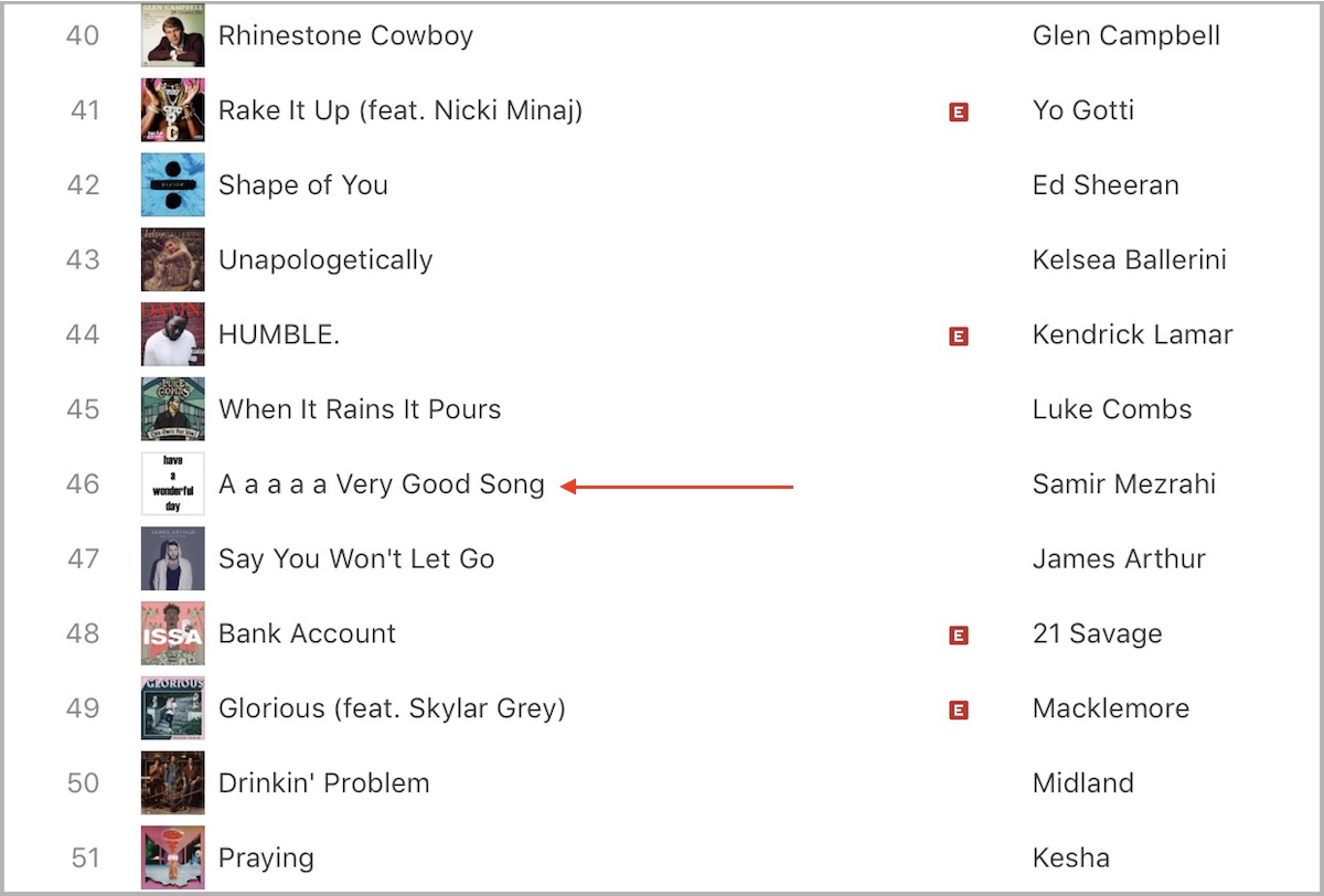 W przypadku niektórych samochodów, podczas podłączenia iPhone’a do portu USB w samochodzie, odtwarzanie muzyki rozpoczyna się automatycznie i zawsze zaczyna się w kolejności alfabetycznej od początku biblioteki iTunes użytkownika. Z tego powodu wielu użytkowników zawsze słyszy ten sam utwór, zwykle zaczynający się od „A”, za każdym razem gdy podłączają swój telefon do samochodu. W tym tygodniu potencjalne rozwiązanie tego problemu wzbiło się na szczyt listy iTunes w formie dziesięciominutowej cichej piosenki zatytułowanej „A a a a very good song”