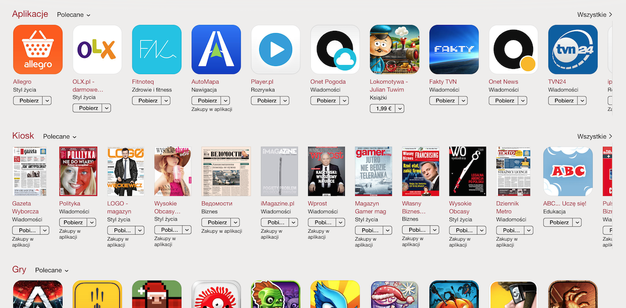 W sekcji możemy też przejrzeć najpopularniejsze polskie płyty, polskojęzyczne iBooki czy też pojawiające się już polskie filmy.