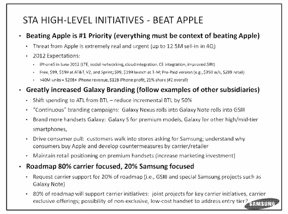 Dokument opisują „wnioski” wyciągnięte z 2011 roku i prognozy przedsiębiorstwa na rok 2012, dalsza plany rozwojowe smartfonów marki „Galaxy” w obliczu sporów z Apple. Wygląda na to, że Samsung miał wyraźny cel na firmę z Cupertino, stwierdzając że „pobicie Apple jest priorytetem nr 1”, nawet do tego stopnia, że jak czytamy: „wszystko musi mieć kontekst pokonujący Apple”. Samsung uznał, że zagrożenie ze strony Apple jest „bardzo realne i ważne”.