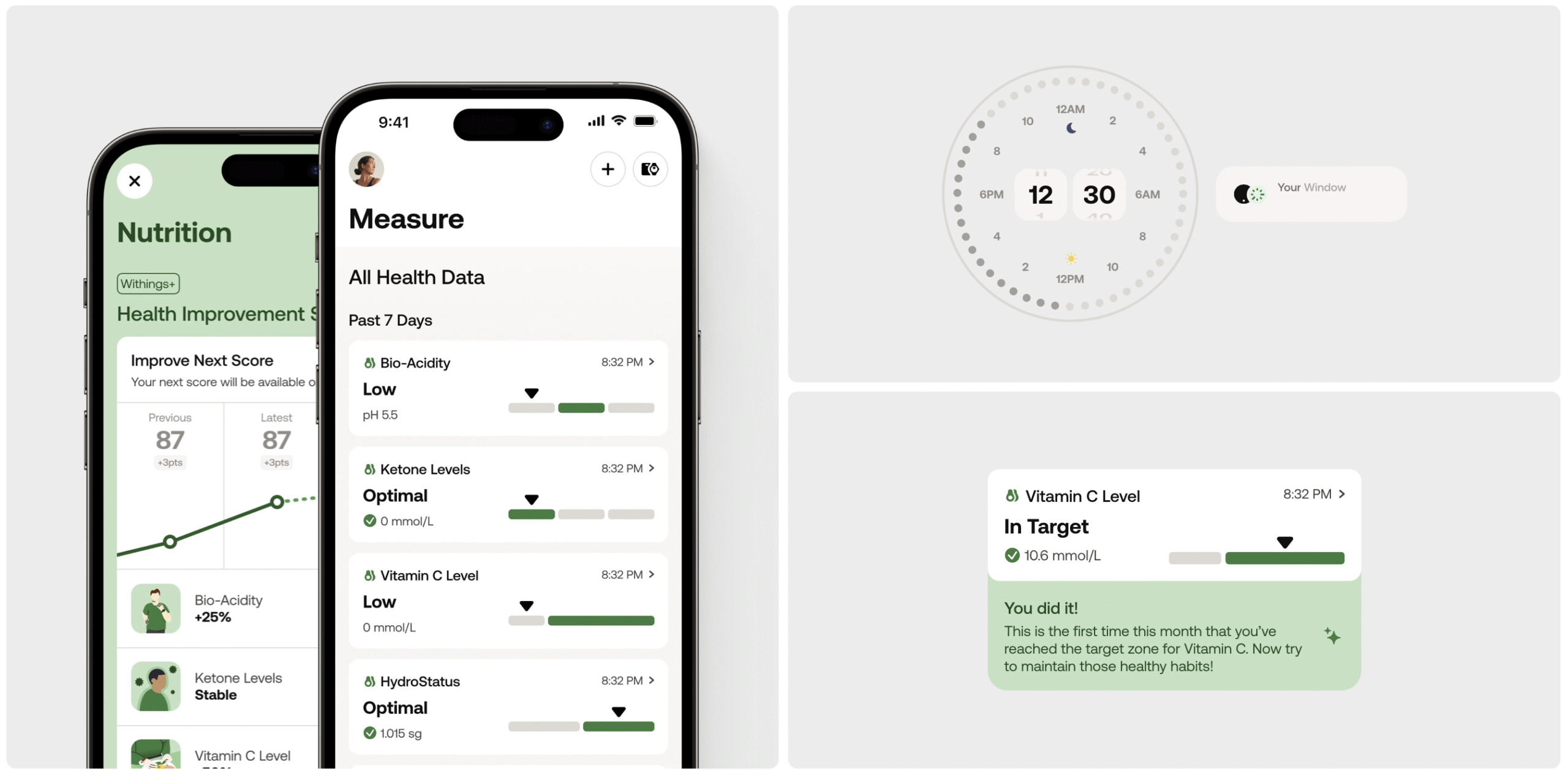 - Nutrio – monitoruje parametry odżywienia i nawodnienia, w tym poziom ketonów, witaminy C, pH oraz wskaźniki nawodnienia.