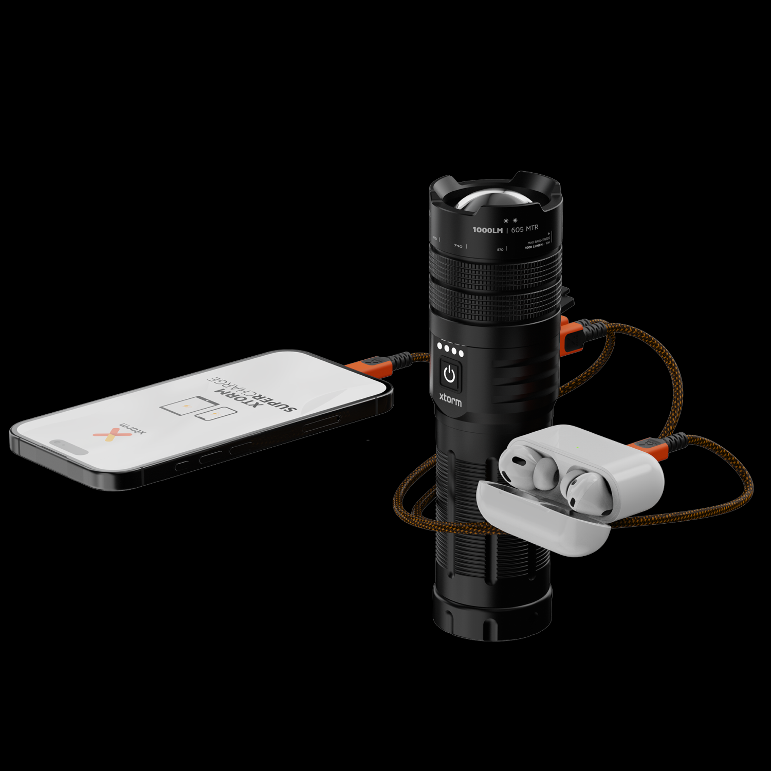 Z XTORM Powerbank Flashlight jest zupełnie inaczej, jako że urządzenie wyposażono w klasyczną głowicę latarki z odbłyśnikiem oraz diodę LED o mocy 15W, która może wygenerować sięgający 605 m strumień światła o jasności 1000 lumenów. Warto dodać, że w trybie maksymalnej jasności 1000 lm latarka może pracować do 10 h, zaś w trybie obniżonej mocy (300 lm) – do 25 h.