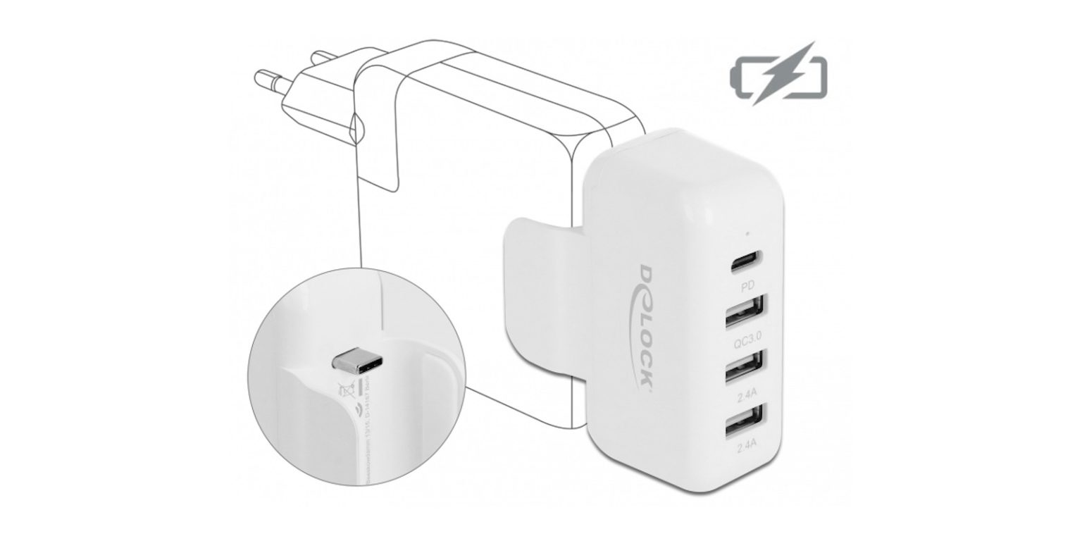 Od 2016 roku MacBooki dostarczane są z zasilaczami, z nowoczesnym gniazdem USB-C. Niestety, jest ono tylko jedno. Dla tych, którzy chcieliby w pełni wykorzystać jego potencjał firma Delock proponuje adapter 64079. Przekształca on standardowy zasilacz w praktyczną, uniwersalną ładowarkę.